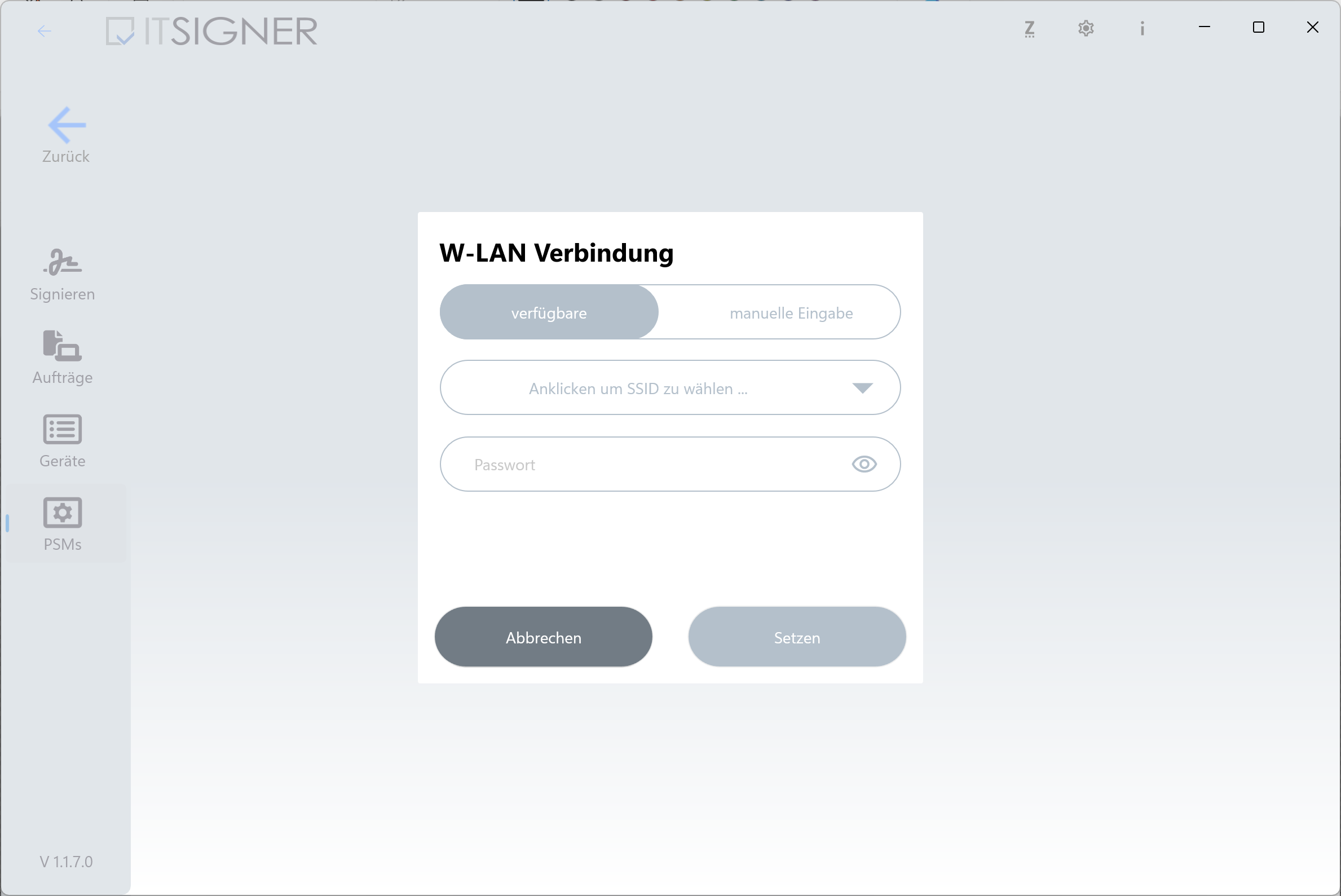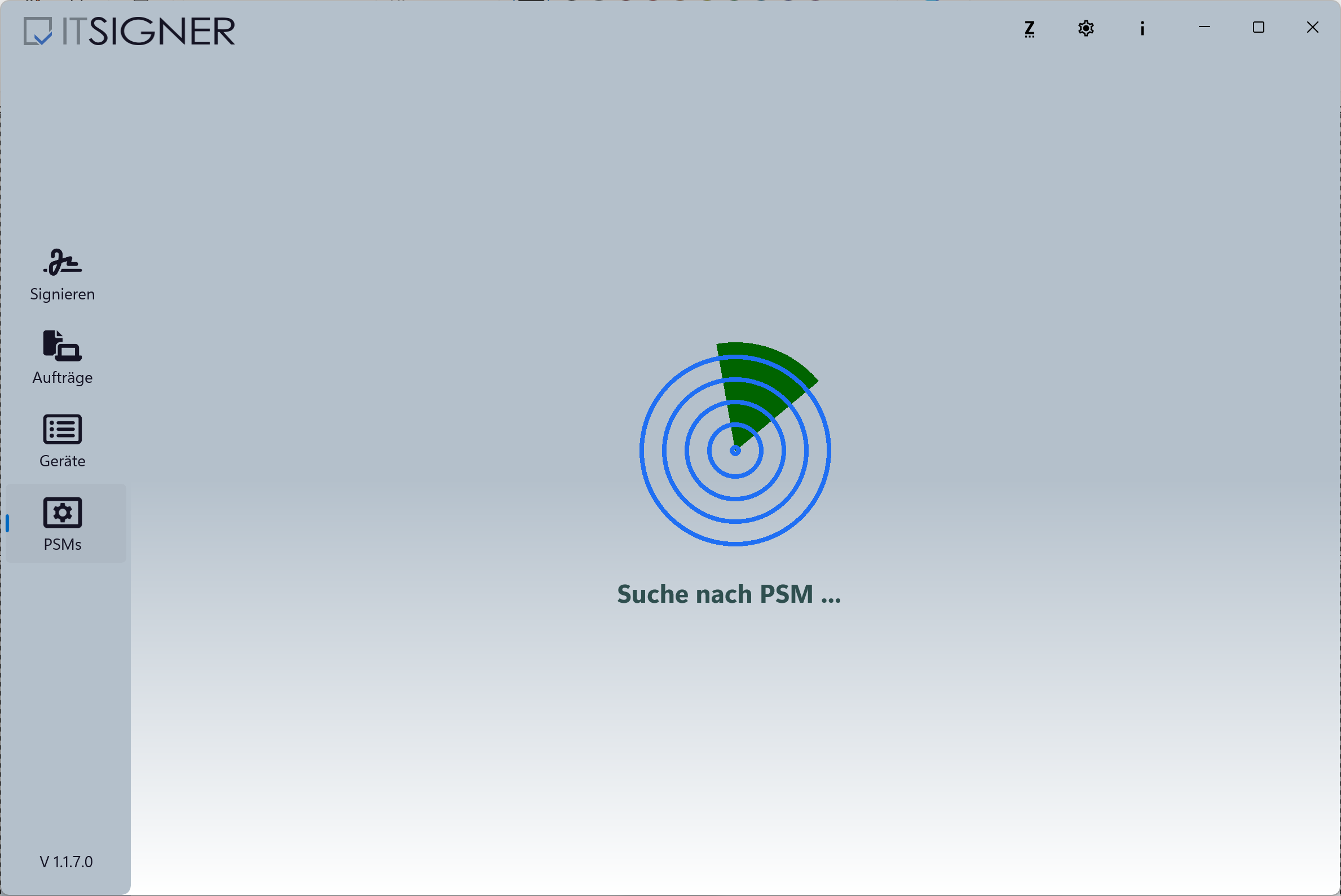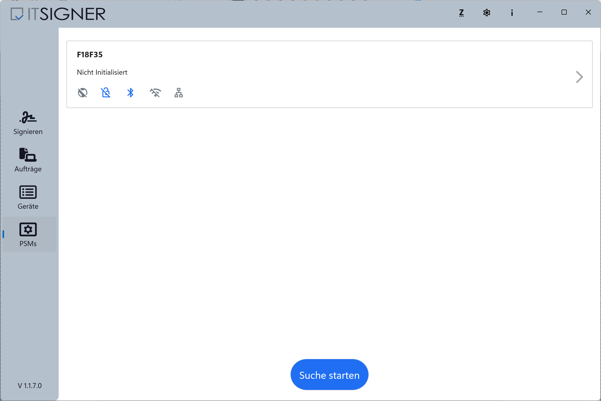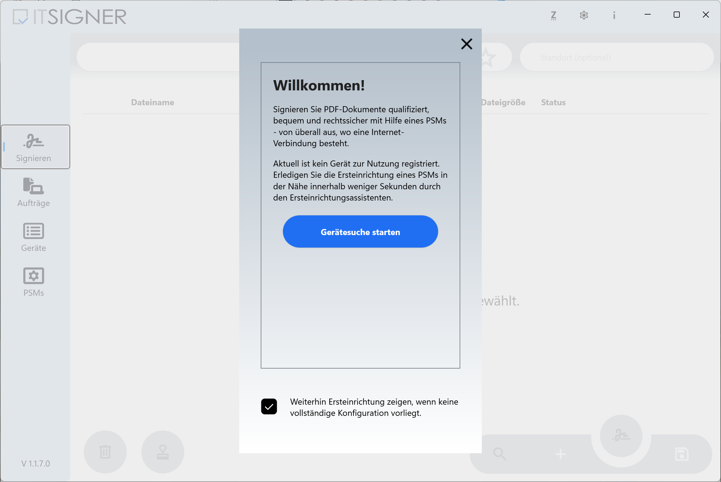 Lors du premier démarrage de l’application, des autorisations pour l’accès Bluetooth et la recherche d’appareils sur le réseau local peuvent être demandées. Autorisez l’accès pour permettre la configuration du PSM. Un assistant guide ensuite à travers la configuration tant qu’aucun périphérique de signature n’a été attribué.