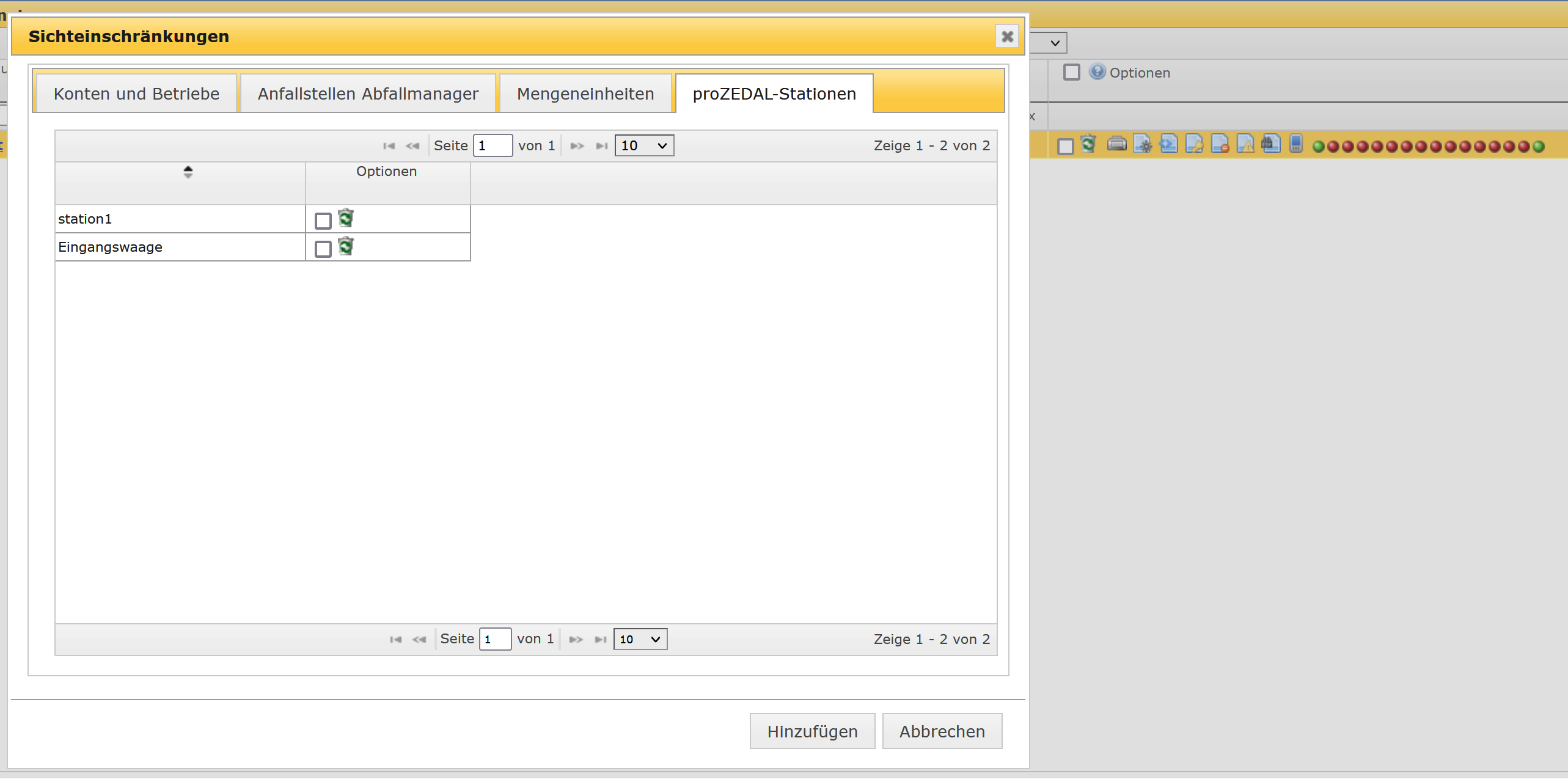 Aus dieser Liste können anschließend in der Benutzerverwaltung über das Icon zur Sichteinschränkung jedem ZEDAL-Benutzer die für diesen verfügbaren Stationen zugewiesen werden. Auch die grundlegenden Rechte zur Verwendung des proZEDAL-WebClients können hier zugewiesen werden. Klicken Sie dazu auf das entsprechende Punkt-Icon rechts am jeweiligen Benutzer und setzen Sie die gewünschten Berechtigungen.