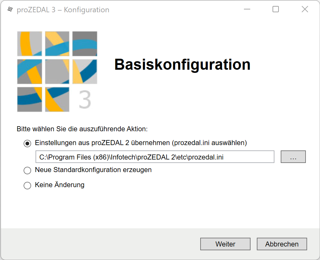 Wählen Sie die bisher genutzte prozedal.ini (aus dem etc-Ordner) aus. Der Konfigurationsassistent übernimmt die dort hinterlegten Einstellungen für proZEDAL 3.