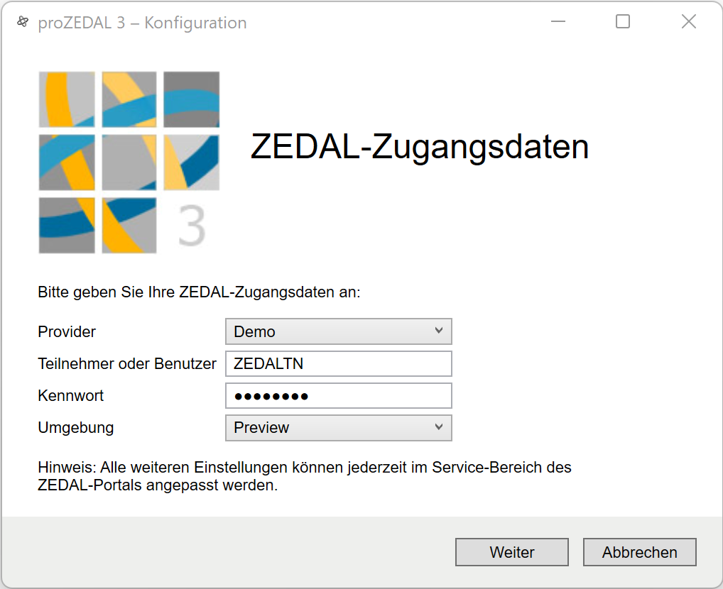 Anschließend wird automatisch ein Maschinenzugang bei ZEDAL für proZEDAL 3 angelegt und falls gewünscht der neue Data Transfer Agent gestartet. Er übernimmt fortan den Datentransfer aus und zu Ihren Übergabeverzeichnissen.