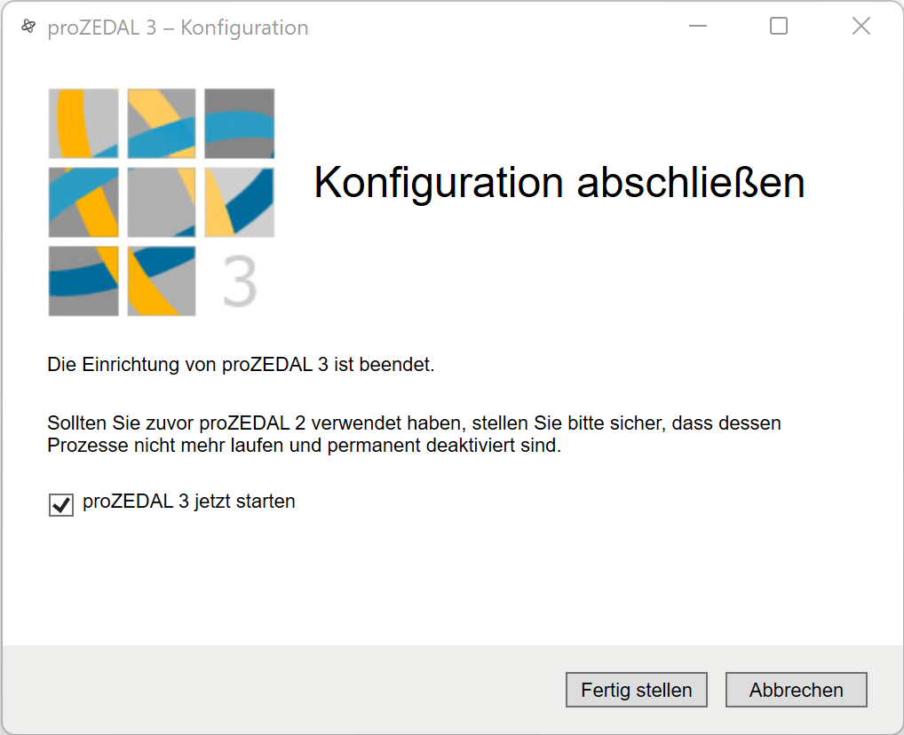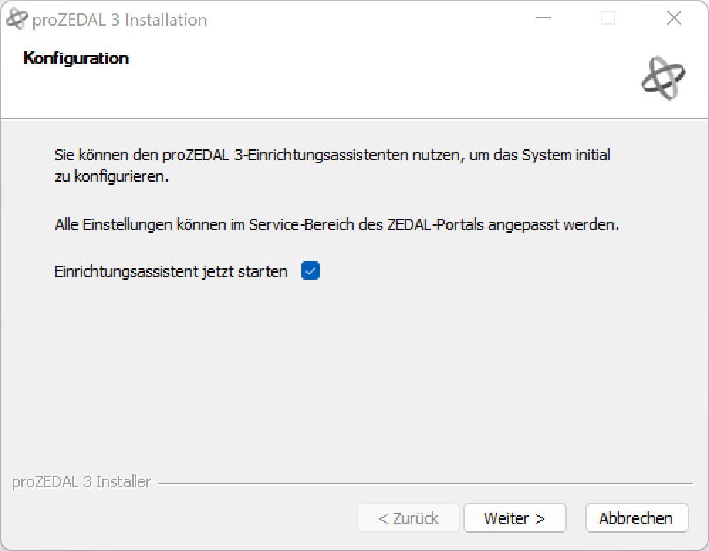 Starten Sie das Setup. Die Installation erfolgt vollständig geführt. Durch Setzen der Option Einrichtungsassistent jetzt starten kann eine vorhandene proZEDAL 2-Konfiguration übernommen werden.