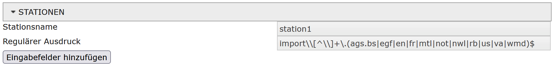 Die Sektion Stationen kann durch Klick darauf expandiert werden. Darunter kann die Zuordnung von regulären Ausdrücken, die auf die vollständigen Dateinamen der übergebenen Dateien angewandt werden, zu einzelnen proZEDAL-Stationen erfolgen. Einbezogen werden alle Dateien, die direkt im Ausgangspfad oder in einem Unterverzeichnis davon liegen.