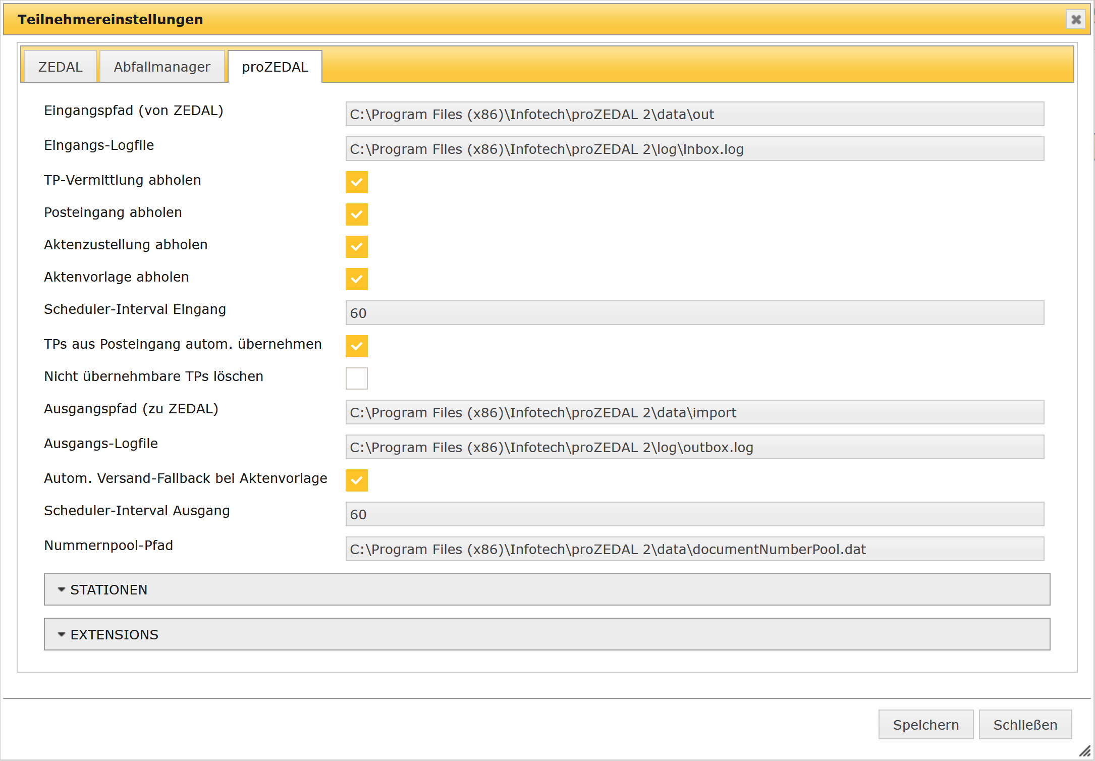 Wie zuvor erwähnt wird die bisher genutzte Konfiguration komplett übernommen. Sollen daran später Änderungen erforderlich werden, so können diese im Service-Bereich des ZEDAL-Portals gemacht werden. Auch die nutzbaren Stationen werden dort unter dem Punkt Stammdaten -> proZEDAL-Stationen verwaltet.